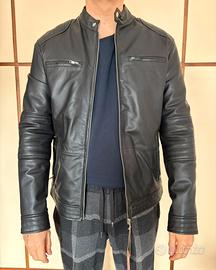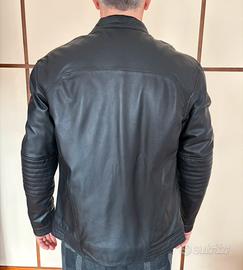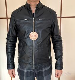 Giacca in pelle nera biker da uomo in stile Café Racer, realizzata in vera pelle di agnello al 100% con fodera interna. Vestibilità Slim fit.