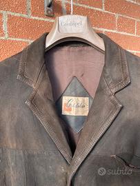 , tasche e taschino a filetto rifilati in pelle . Fattura della giacca artigianale con punti a vista , prodotta da sartoria in Belgio . Non ci sono tagli , strappi o difetti visibili , qualche punto di usura , per esempio nelle asole ma nulla di più . Fodera sana ma chiaramente vintage .