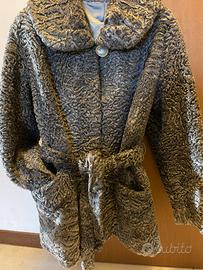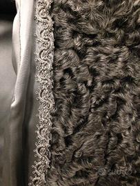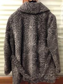 Stupenda giacca di pelliccia Astrakan/Breitschwanz colore grigio perla con cinta, collo ampio con bel bottone, chiusura anche con ganci non visibile perché nascosti dalla pelliccia, 2 tasche capienti a taglio orizzontale ed una tasca interna nella fodera.