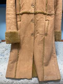 cappotto lungo in ecopelle scamosciata molto caldo color cammello con fodera e bordi in pelliccia sintetica, Il design è ispirato alla moda boho degli anni '70