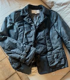 Giacca piumino Marlboro Classic originale, taglia 42, per donna-ragazza, imbottito, tessuto tipo militare-mimetico con 3 tonalità di grigio, chiusura con 3 bottoni, 2 mostrine triangolari in cuoio marrone sulle spalle, taglio leggermente sciancrato in vita, cinturini stringipolso con doppio bottone, 2 tasche apposte esternamente sul davanti, revers collo e le 3 asole in contrasto in lana grigio scuro.