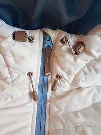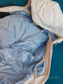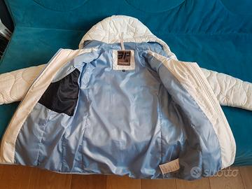 Giacca piumino bianca con rifiniture celesti-azzurre, cappuccio non rimovibile, marca 3P by Icepeak. Lunghezza ai fianchi circa, sciancrato. Tasca interna. Usato pochissime volte, nessun segno di usura o danno, ottimo stato. Taglia 44 (M)
