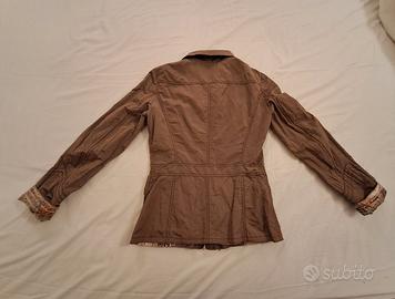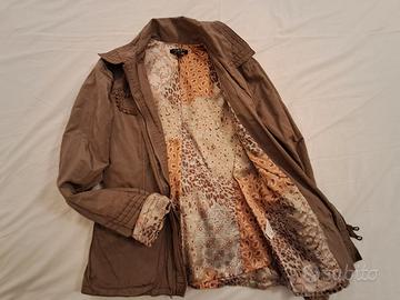 Giacca primaverile/autunnale da donna in tessuto tecnico color verde/tortora cangiante con inserti in pelle marrone foderata in seta con fantasia fiori/animalier/cachemire.
