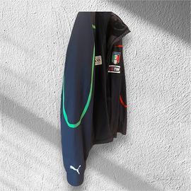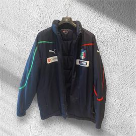Vendo giacca ufficiale Puma della Nazionale Italiana, colore blu navy. Modello invernale imbottito, con zip frontale e tasche laterali. Presenta gli sponsor originali (Compass, TIM) e lo stemma FIGC sul petto. Dettagli in verde, bianco e rosso sulle spalle. PREZZO TRATTABILE