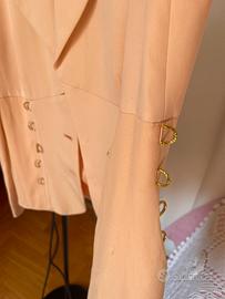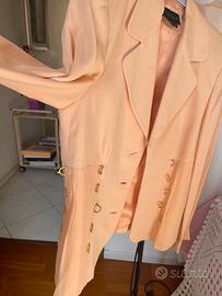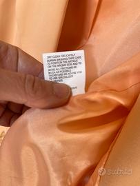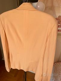 Bellissima giacca,realizzata incrêpes fi pura seta,color albicocca,Luisa Spagnoli,cerimonia o anche informale su jeans bianco.Completamente foderata,presenta bei ganci dorati con strass,dove eventualmente inserire nastri ),si può indossare libera opp.cucire 2/3bottoni,data la presenza di asole.Linea sagomata.Presenta un piccolo segno su un collo,poco visibile.