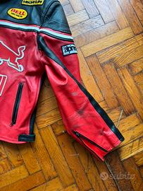Stupenda giacca in pelle Racing Red Bull colore rosso e nero con patch ricamate (Motul, Michelin, Bell Helmets, Red Bull).