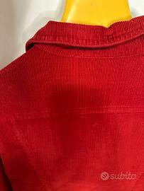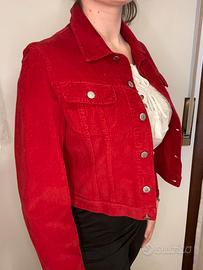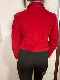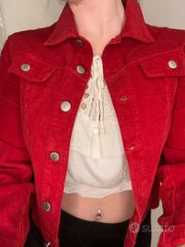 Giacca in velluto a coste rosso acceso, taglio corto e femminile. Perfetta per la mezza stagione, da abbinare con jeans o gonne a vita alta.