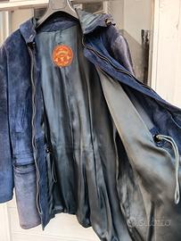giacca scamosciata donna blu scuro taglia L. regolabile in cintura con coulisse interna. Ha il cappuccio attaccato. Ottime condizioni. La pelle è intatta e le sfumature di colore sono dovute alla luce della foto