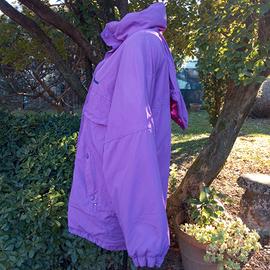 Chiusura con cerniera e bottoni a pressione, 4 tasche con zip, cappuccio estraibile dal colletto, maniche raglan, colore ciclamino.
