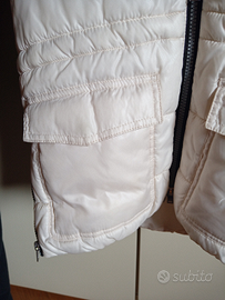Giacca imbottita panna senza maniche con il pelo solo sul cappuccio.