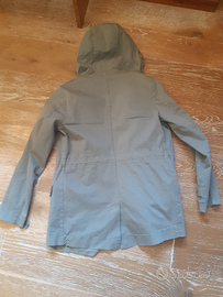 Giacca sfoderata color verde chiaro militare, con bottoni e cerniera e cappuccio. Taglia S da adulto