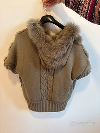 Giacca grigia smanicata (42% pelliccia di coniglio e 58% acrilico) con cappuccio e chiusura a zip.