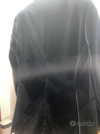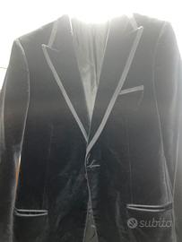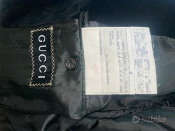 Elegante giacca smoking da uomo firmata Gucci, modello 28GKF8, realizzata in cotone vellutato nero di altissima qualità. Dettagli raffinati con rever in raso, tasche a filetto e chiusura a due bottoni. Interno completamente foderato con monogramma “Gucci” e bottone di ricambio originale ancora attaccato.
