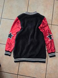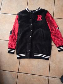 Giacca stile college nera con maniche rosse ricoperte di paillettes. Corpo morbido effetto peluche, con chiusura a bottoni automatici. Dettaglio con lettera “R” sul petto e finiture elastiche a righe su collo, polsi e fondo. Calda, originale e molto stilosa. In ottime condizioni. prezzo trattabile