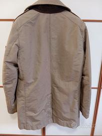 Caratteristiche: color sabbia, colletto alla francese, chiusura sul collo, chiusura doppiopetto con bottoni, maniche lunghe, orli con abbottonatura, due tasche laterali con bottone, spacco centrale sul retro, orlo dritto, lunghezza sopra il ginocchio, fodera trapuntata.