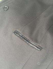 All’interno non c’è la targhetta composizione tessuto ma è pesante , credo lana ! Veste tranquillamente una 44! Allacciata con un bottone , interamente foderata