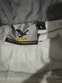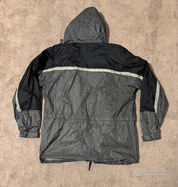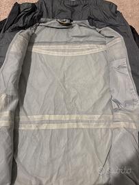 Materiale antivento e idrorepellente, fodera interna in rete traspirante, cappuccio richiudibile nel collo, chiusura con zip + velcro, tasche con zip.