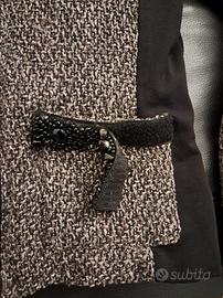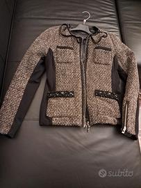 Giacca corta termica Twin-Set by Simona Barbieri, stile Giacca Chanel, pari al nuovo, taglia L, esternamente in elegante tweed/bouclé a trama scura, mentre l'interno del corpo e delle maniche è in piumino nero lucido e trapuntato per un comfort termico.