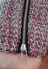Vendo giacca di H&M in tessuto effetto bouclé, nuovissima, mai indossata (l'etichetta della composizione è intatta), color melange rosa/fucsia e bianco, interamente foderata, linea leggermente sciancrata e corta in vita, con manica appena più lunga dei 3/4 con zip sul finale della manica, ampio scollo tondo, abbottonatura con zip su tutta la lunghezza con cursore e 2 taschine sul davanti, tg 42 ita (38 eu). Misure: largh. spalle cm 39, lungh. manica cm 55 e lungh. da centro dietro cm 44. Prezzo eu 25.