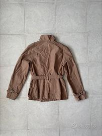 Elegante e pratica giacca leggera da donna, ideale per la mezza stagione (primavera e autunno). Il colore è un classico e versatilissimo beige / cammello. Il modello ricorda una "sahariana" dal taglio femminile: presenta un collo alto per proteggere dal vento, chiusura frontale, due comode tasche basse e una pratica cintura in vita con fibbia, perfetta per avvitare e valorizzare la silhouette. • Tessuto esterno: 51% Cotone, 49% Poliammide. • Fodera interna: 100% Poliestere. Condizioni: Ottime condizioni generali. Non presenta difetti, macchie o strappi. Taglia: 42 IT (corrisponde a una S/M).