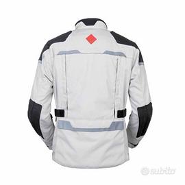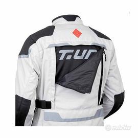 Giacca triplo strato T.UR J-Two - Grigio/Nero; realizzata in Cordura con trattamento idrorepellente, inserti in vera pelle bovina su spalle e gomiti, interno collo in neoprene morbido, protezioni ventilate LP2 PRO in D3O CE-livello 2, (esclusiva mondiale), tasche per protezioni sul petto, tascha posteriore per paraschiena e per sacca liquidi, numerose aperture prese d'aria, tasche cargo interne ed esterne, membrana 100%impermeabile, stampe rifrangenti e numerose regolazioni volumi, sistema di connessione al pantalone P-One.