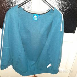 Giacca di tuta felpata ADIDAS, secondo me, unisex, Taglia S standard Adidas, colori azzurro scuro e grigio, con cappuccio, due tasche verticali frontali come da foto. Capo in ottimo stato. Larghezza spalla - spalla 44 cm, girovita 98 cm, lunghezza dalla spalla all'estremità del bordo inferiore 72 cm, lunghezza della manica 58 cm.