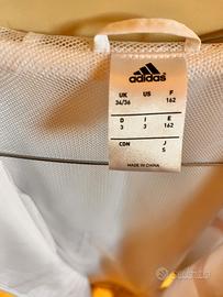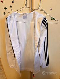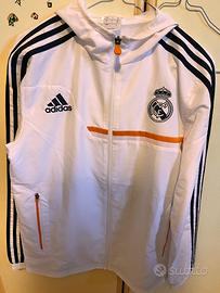 Vendo giacca della tuta ufficiale Real Madrid Adidas, stagione circa 2013/2014. Colore bianco con dettagli neri e inserti arancioni, logo Adidas e stemma Real Madrid ricamati. Modello sportivo con cappuccio, zip centrale e bande Adidas sulle maniche. Perfetta per appassionati di calcio, collezionisti o per outfit sportivo/vintage.
