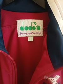 Splendida giacca sportivaDiadora originalein stile vintage (anni '80/'90). Il capo presenta un vivace colorefucsiacon dettagli a contrasto blu navy e bianchi.