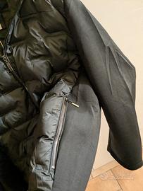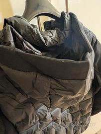 Giubbotto nero, con imbottitura e maniche con stoffa impermeabile , cerniera doppia apertura, 2 tasche con cerniera, cappuccio regolabile.