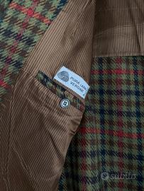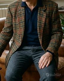 Giacca Proposte uomo monopetto vintage realizzata in un pregiato tessuto tweed di pura lana vergine, come confermato dall'etichetta interna con la dicitura "Pura Lana Vergine". Il tessuto presenta un classico motivo scozzese (plaid) su base verde oliva, arricchito da linee sovrapposte nei toni del rosso, blu navy e ocra, che conferiscono al capo un aspetto caldo e sofisticato. La giacca presenta una particolarità distintiva: la fodera interna, visibile nel sottomanica e nella fodera del bavero, è in un raffinato tessuto marrone a micro-righe (pinstripe). Tg. 52
