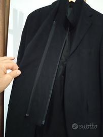 giacca nera ad un petto, di cotone con fodera di viscosa. Taglia 52 6/R. Tre tasche esterne, di cui una con cerniera, e taschino ancora cucito. Tre taschini interni. Gilettino interno rimovibile. Usata una sola volta.