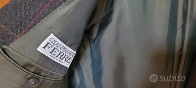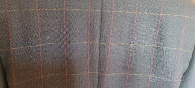 Giacca di Gianfranco Ferrè. Colore grigio antracite. Ha righine sottilissime rosse e gialle che formano dei quadrati. Taglia 50. Tessuto in pura lana vergine. Capo autunno-inverno.