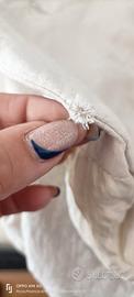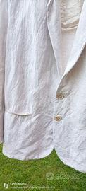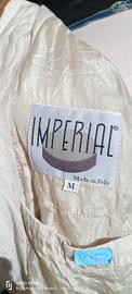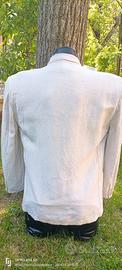 Giacca Imperial taglia M in lino elasticizzato , foderata spalla imbottite , la giacca presenta alcune imperfezioni una piccola scucitura sul fondo fotografata, è una striscia dietro un po' più gialla quasi invisibile. La giacca è stata lavata quindi ha bisogno di essere stirata per rimettere in ordine anche la fodera interna colore naturale