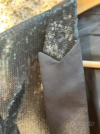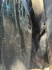 Elegante giacca da uomo con paillettes nere, chiusura a 1 bottone e revers a lancia in raso nero, taglia 52. Mai usata, tasche e spacco posteriore ancora cuciti. Perfetta per occasioni speciali!