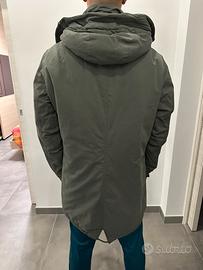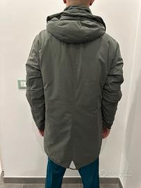 Parka da uomo imbottito con cappuccio, due tasche esterne ed una tasca interna. Chiusura a zip piu bottoni. Lunghezza 94cm, Larghezza spalla 51cm.