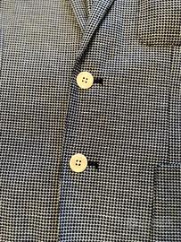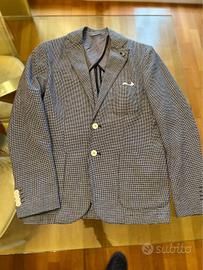 Giacca uomo slim fit, con fazzolettino e spilla. Moderna/Giovanile. Scacchi piccoli bianchi e blu/nero. Indossata 1 volta per un’occasione, taglia 44 ma va bene anche a chi ha una 46 e veste aderente