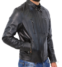 Giacca da uomo, stile biker classico da moto, in vera pelle ovina di nappa, colore nero lucido, 100% Made in Italy, no ecopelle, no sintetico!