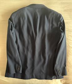Giacca monopetto ZARA in blu navy, realizzata in tessuto liscio, chiusura a due bottoni, rever classico, tasche frontali a pattina e taschino sul petto, spacchetti posteriori, bottoni sui polsi.