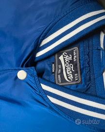 giacca varsity blu e bianca, perfetta per un look casual e sportivo ispirato al college americano.