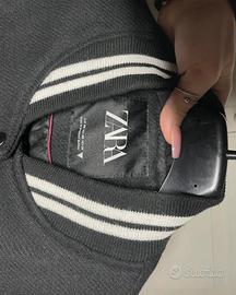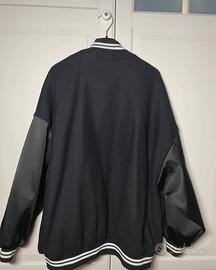 giacca varsity nera di Zara, perfetta per un look sportivo e alla moda. Il design presenta un mix di materiali: corpo in tessuto spesso con maniche in similpelle per un tocco vintage.