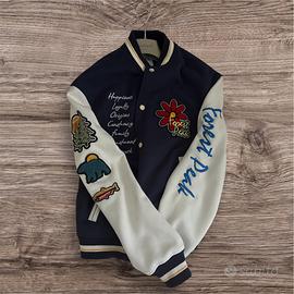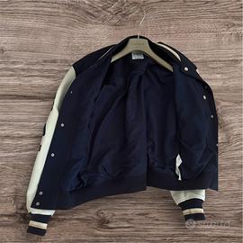 Vendo giacca varsity ZARA in stile college, colore blu navy con maniche bianco crema. Presenta ricami decorativi sul petto: da un lato una lista di valori (“Happiness, Loyalty, Origins…”), dall’altro un patch con fiore e scritta Forest Peak.