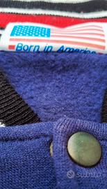 Modello stile college americano, con logo ricamato, chiusura a bottoni e bordi elasticizzati a righe.