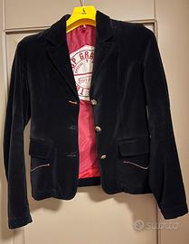 Chiusura tramite tre bottoni decorativi in metallo, di cui quello superiore, diverso dai due sottostanti, porta incastonata una pietruzza luminosa.