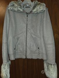 Colore e Materiale: La giacca è di un colore neutro, tra il grigio e il tortora, con un aspetto che ricorda la pelle scamosciata o sintetica. L'interno e i bordi sono foderati in una spessa e morbida pelliccia sintetica di un tono marrone/grigio più scuro.