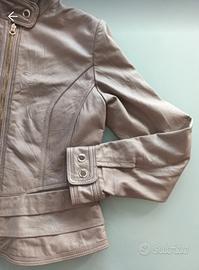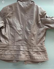 Giacca da donna in vera pelle di alta qualità, color tortora/fango. Modello sciancrato con particolare lavorazione effetto "stropicciato", collo alla coreana e dettagli dorati. Molto rifinita sui polsini e sulla base. Taglia L, ottime condizioni, fodera interna intatta. Elegante e versatile, come nuova