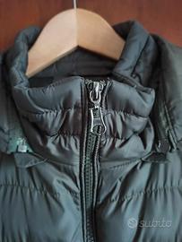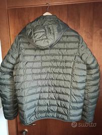 Piumino in Polyestre, marca Serpy Tg XXL, non veste eccessivamente, colore verde tipo militare, cappuccio removibile, condizione molto buona, caldo e leggero.