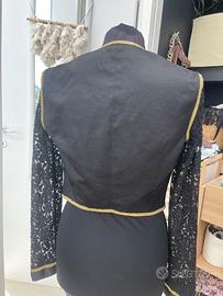 Questa giacca corta in cotone nero presenta un taglio sartoriale impreziosito da profili in passamaneria dorata, maniche lavorate in tessuto a rilievo e una chiusura con bottoni gioiello unici – ciascuno diverso e ricco di dettagli.