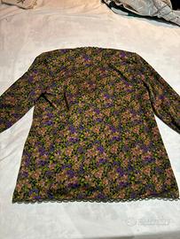 Splendida giacca vintage (marca Carolina Pedrjoni) dal fascino retrò e romantico. Il capo presenta una bellissima stampa floreale all-over nei toni del viola, rosa e verde oliva.