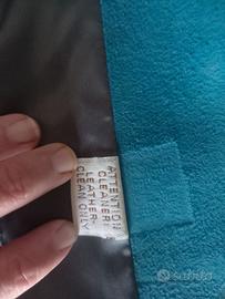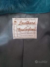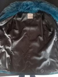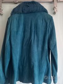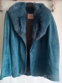 Giacca vintage originale anni '70 in pelle scamosciata tinta turchese e collo in pelliccia di volpe. Una cintura nello stesso materiale completa la giacca. Interno foderato. La già veste una taglia IT 42