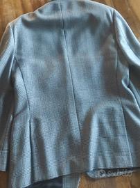 Il design presenta una chiusura a due bottoni e un accostamento cromatico molto raffinato tra il grigio e l'azzurro polvere, rendendola ideale per spezzare un look formale o per essere abbinata a un denim scuro per un outfit casual-chic. Internamente la giacca è rifinita con cura e completamente foderata, a testimonianza della solida manifattura "Made in Italy" dell'epoca.